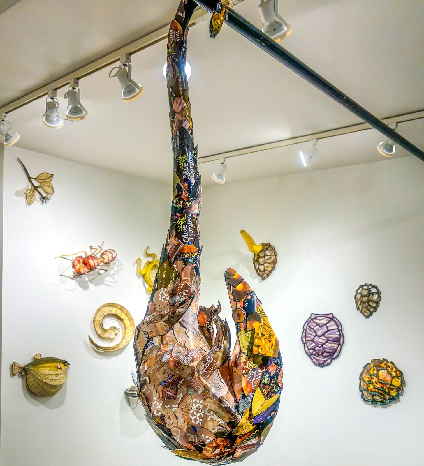 Understood as one of the early pioneers in the field of ecological art activism, the artist, activist and thought-leader Christy Rupp has an international reputation. This solo exhibition Streaming will feature a survey of Rupp’s intricate collages, wall installations and free-standing sculpture, which chronicle the ongoing tension between natural systems and the environment in transition, and call our attention to our interconnectedness with non-humans and habitat – transmuting detritus gathered from the waste stream through collage and sculpture to reveal what is hidden away from common view and understanding. Informed by science and the historical representation of natural history, the artwork in this exhibition examines the way we frame our opinions of nature, using irony and wit to represent the human impact on our natural habitat.