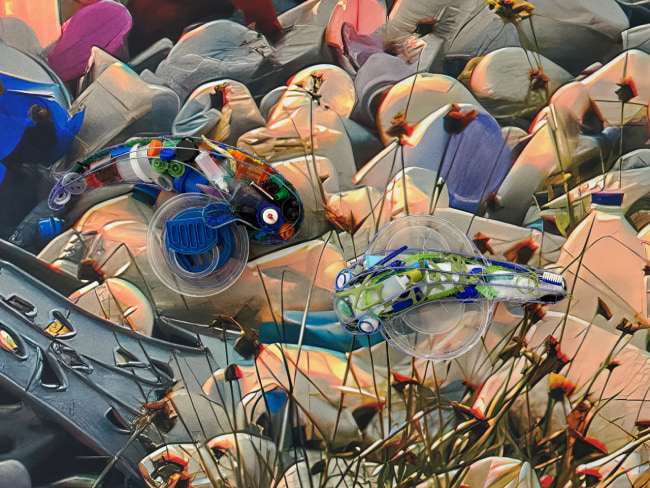 discarded plastic. To quote artist and art scholar Ellen K. Levy, “Rupp considers how waste and toxic elements in our environment corrupt the accepted way in which organisms function and evolve…Each of her aquatic-inspired “organisms” is composed of discarded plastic detritus and visually comments on the damage done to species when they consume the glut of inorganic detritus hurled into our food chain.” In magnifying the petroplanktonic microbes that inevitably find their way into a whale's stomach, Rupp clarifies the irony of a food chain where the smallest organisms sustain the largest mammals along with the floating oceanic plastic waste that accompanies them into a whale's stomach. A similar statement is made with the plastic-stuffed wall works of Aquatic Larvae, with the paradox of young hatchling fishes nurtured in egg sacks populated by a buffet of accumulated microplastics.